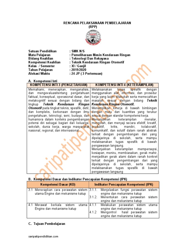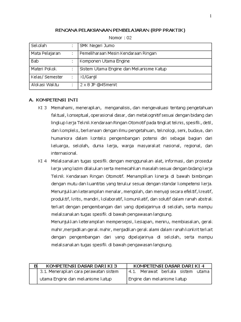 Rpp 1 lembar pemeliharaan mesin kendaraan ringan kelas xi smk kurikulum 2013 revisi 2020 model pembelajaran : Rpp pemeliharaan mesin kendaraan ringan kelas xi tkro pembelajaran daring dan luring ( kombinasi ) kurikulum 2013 revisi disesuaikan pada masa pandemi covid 19 atau pembelajaran dirumah namun dikombinasikan dengan pembelajaran praktikum ( luring ) sesuai dengan protokol. Rpp pemeliharaan mesin tenaga kendaraan ringan haruslah sesuai dengan kurikulum terbaru yaitu kurikulum 2013 revisi. Rpp bahasa indonesia sekolah menengan atas kelas x kurikulum 2013 ini sanggup juga anda terapkan pribadi hanya dengan mengganti datanya saja, tetapi lebih manis lagi kalau ini hanya sekedar dijadikan tumpuan untuk anda membuat contoh rpp sma kurikulum 2013 sendiri. Semoga bermanfaat, jika berkenan silahkan berkontribusi untuk pengembangan blog ini.